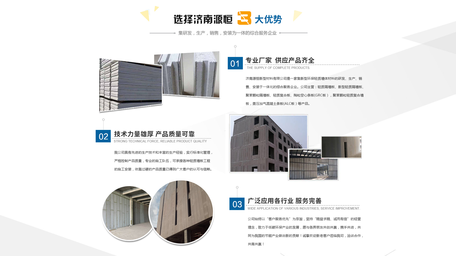 濟南源恒新型材料有限公司坐落于美麗的泉城濟南,是集新型環(huán)保輕質(zhì)墻體材料的研發(fā)、生產(chǎn)、銷售、安裝于一體化的綜合服務(wù)企業(yè)。我公司具有的生產(chǎn)技術(shù)和豐富的生產(chǎn)經(jīng)驗,為您提供輕質(zhì)隔墻板、新型輕質(zhì)隔墻板、聚苯顆粒隔墻板、輕質(zhì)復(fù)合板、陶??招臈l板(GRC板),聚苯顆粒輕質(zhì)復(fù)合墻板,蒸壓加氣混凝土條板(ALC板)等產(chǎn)品,本公司有專的施工隊伍,可承接各種輕質(zhì)墻板工程的施工安裝。輕質(zhì)隔墻板是國家推廣使用的新型輕質(zhì)、綠色無害建材,是墻改節(jié)能政策大力扶持的環(huán)保節(jié)能產(chǎn)品,是發(fā)達國家普遍采用的新型墻體材料。濟南源恒新型材料有限公司實行標(biāo)準(zhǔn)化管理,嚴格控制產(chǎn)品質(zhì)量,依靠過硬的產(chǎn)品質(zhì)量已得到廣大客戶的認可與信賴。公司產(chǎn)品遍布各大城市,與國內(nèi)多家客戶建立了良好的合作關(guān)系。公司始終以“客戶服務(wù)優(yōu)先”為宗旨,堅持“精益求精、誠而有信”的經(jīng)營理念,致力于低碳環(huán)保產(chǎn)業(yè)的發(fā)展,愿與各界朋友共創(chuàng)共贏,攜手共進,共同為我國的節(jié)能產(chǎn)業(yè)做出新的...